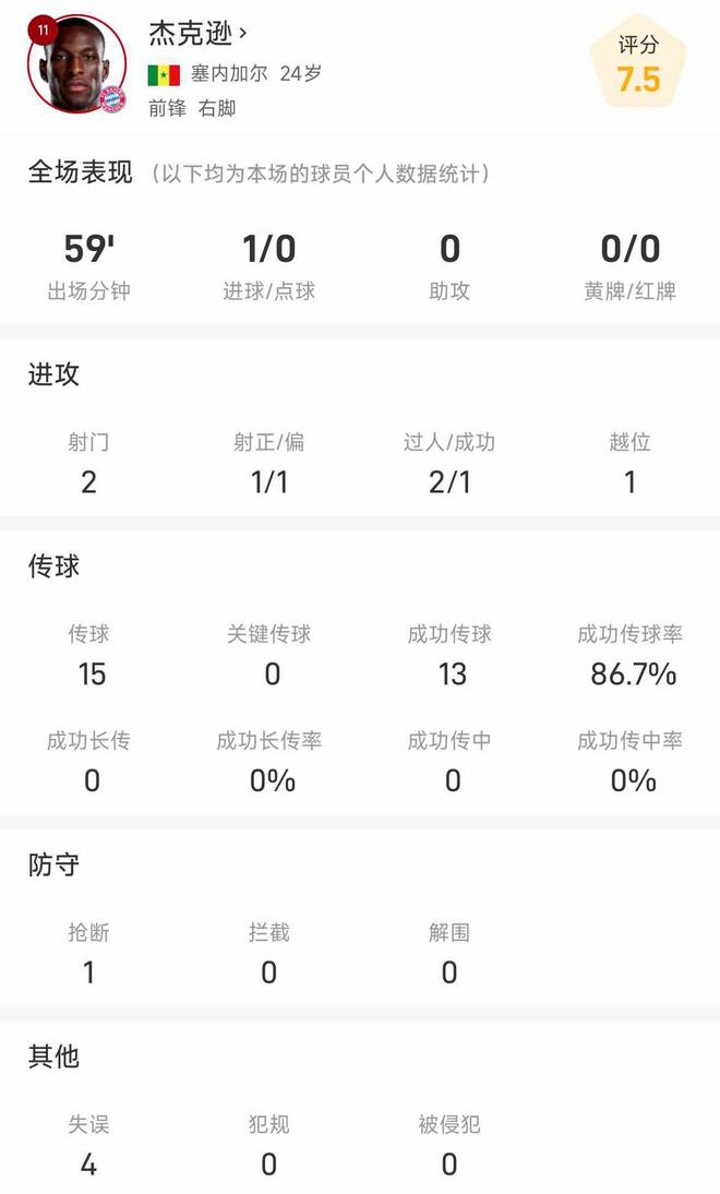 杰克逊数据:出场59分钟,2次射门就打入1球