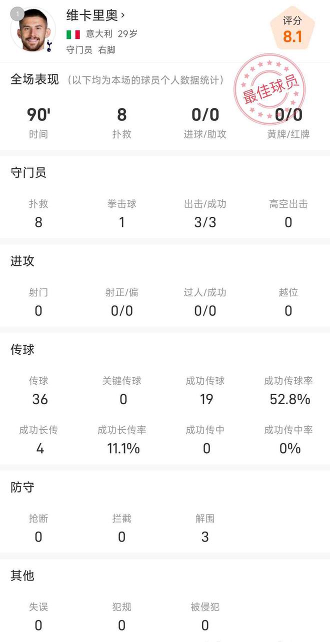 维卡里奥数据:全场完成8次扑救,遗憾未能帮助球队避免败局